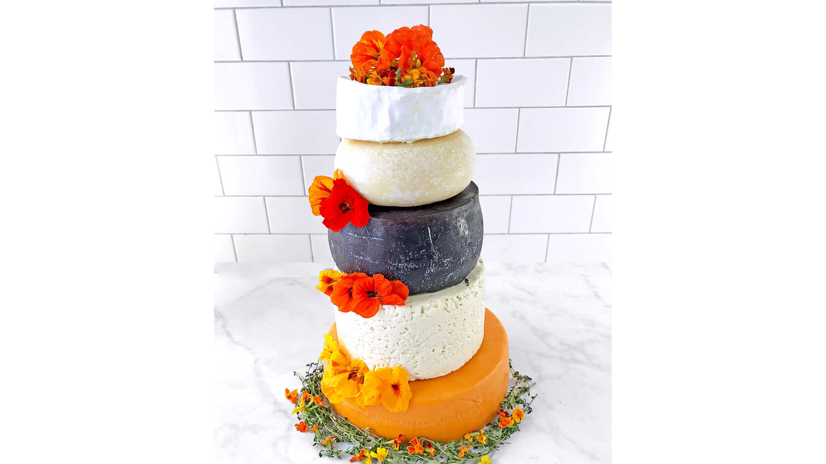 The 'Sid Wainer & Son Cheese Lover Artisian Wedding Cake' is made up of five different gourmet cheese hailing from around the world: Red Leicester, Danish Blue, Murcia al Vino, Tuscan Sheep's Cheese, and Brillat Savarin Triple Cream Brie.